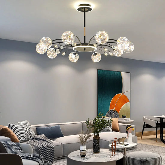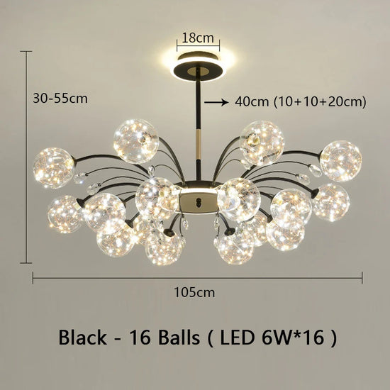 Redéfinissez votre espace avec le lustre LED de luxe en fer avec boules de verre étoilées, un chef-d'œuvre de SANDYHA. Ce luminaire élégant et fonctionnel est conçu pour transformer n'importe quelle pièce en un espace luxueux et accueillant. Avec ses branches en fer noir doré entrelacées et ses boules de verre étoilées, ce lustre est une véritable pièce maîtresse qui attire tous les regards tout en diffusant une lumière douce et chaleureuse.