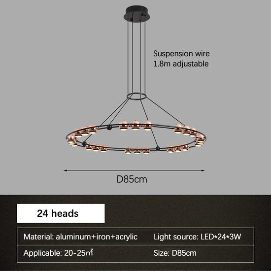 - **Design innovant et élégant** : Un lustre qui combine harmonieusement une forme de haricot unique et un anneau circulaire pour un effet visuel saisissant.