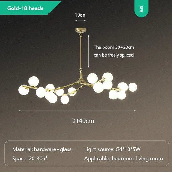 Ce lustre est un exemple parfait de design moderne et épuré. Les branches en fer, disposées de manière organique, offrent une illusion de mouvement et de fluidité. À chaque extrémité, une boule de verre givré abrite une ampoule LED, diffusant une lumière douce et chaleureuse qui crée une ambiance accueillante et apaisante. Le corps du luminaire est fabriqué en fer, assurant solidité et durabilité, tandis que la finition cuivre poli apporte une touche de sophistication.