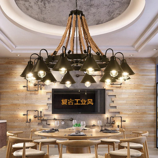 Découvrez le lustre style industriel en ferronnerie et corde de chanvre, une pièce phare qui fusionne audacieusement le charme brut de l'industrie avec la douceur naturelle de la corde. Ce luminaire d'exception s'inscrit dans la tendance actuelle du design intérieur, apportant une touche unique et authentique à toute pièce où il trône. Idéal pour les restaurants, bars, salons, et même les salles d'étude, ce lustre se veut l'allié parfait pour illuminer vos espaces avec style et élégance.