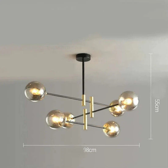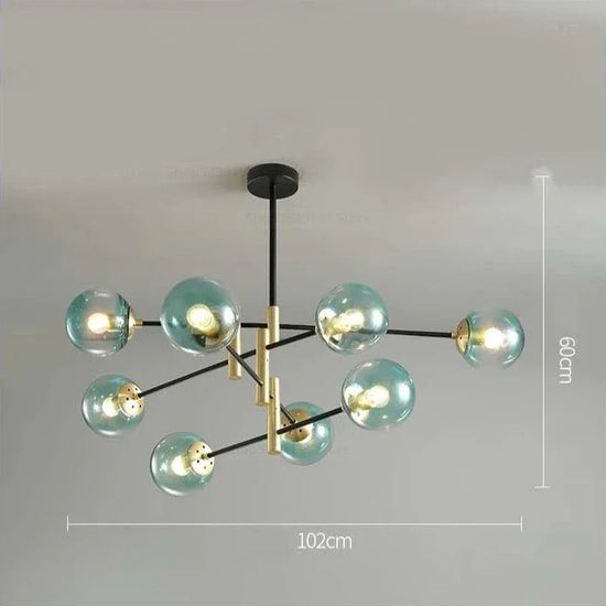 Ce lustre design se distingue par une construction en fer robuste et un abat-jour élégant en verre coloré, reflétant une qualité artisanale exceptionnelle. Chaque aspect a été conçu pour fournir une performance lumineuse optimale tout en ajoutant une touche d'élégance à votre maison.