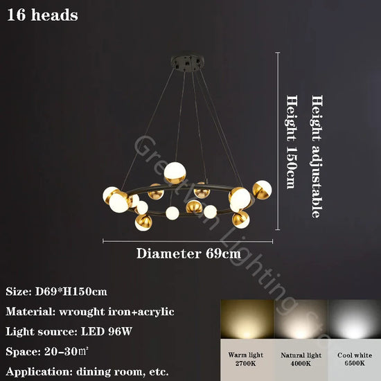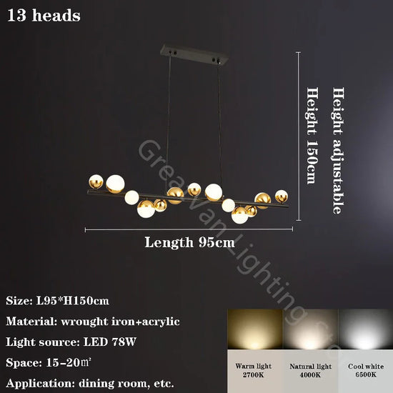 Ce lustre nordique LED ne se contente pas seulement d'ajouter du style à votre intérieur, il vous permet également d'optimiser votre éclairage tout en respectant l'environnement. Les LED intégrées réduisent la consommation énergétique et prolongent la durée de vie du produit. La structure en fer et les boules en verre sont judicieusement choisis pour une durabilité accrue et un look intemporel.